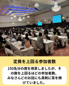 150名分の席を用意させていただましたが、なんと162名の方にご参加いただき大盛況でございました。